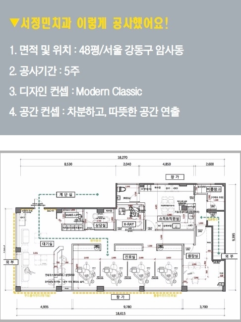대기실은 환자가 들어오자마자 보이는 기둥을 몰딩 포인트 벽으로 활용했고, 비교적 가로로 길게 뻗어 있는 대기실 구조에 맞게 천정에 긴 라인 디자인으로 오히려 연장성을 돋보이게 해 공간의 시원함을 더했다. 치과 인테리어의 가장 중요한 부분이라고 할 수 있는 동선은 직사각형에 가까운 건물형태이기 때문에 체어를 일렬배치하고 주요동선 1개를 통해 상담실, 엑스레이실, 소독실을 배치해 효율성을 높였다.