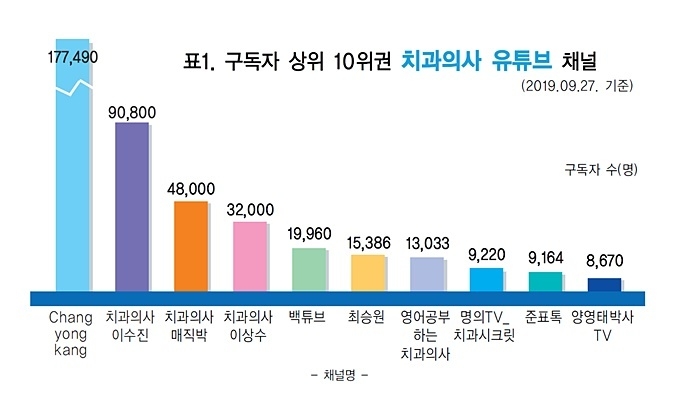 치과의사 개인 유튜브 채널 43개, 최대 구독자 수는 20만명