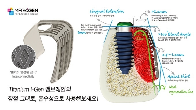 메가젠 관계자는 “LT6 i-Gen type은 기존 티타늄 멤브레인과 달리 추후 제거해야 하는 불편함이 없다. 또 GBR 시술 시 골의 흡수 및 손실을 충분히 고려한 디자인으로, 시술 후 흡수된 골의 양 때문에 발생하는 문제를 줄여 가장 이상적인 ridge 구현이 가능하다”고 전했다.