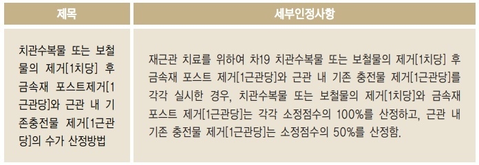 위의 고시 이전에는 당일에 치관부 수복물, 포스트, 근관내 충전물의 3가지 제거를 동시에 시행하는 경우 수가가 제일 높은 포스트 제거 100%, 치관부수복물 제거와 근관 내 충전물 제거는 각각 50%만 인정됐었다. 하지만 현재는 치관부와 치근부의 수복물을 각각 따로 비교해 치관수복물과 포스트 제거가 각각 100% 인정이 되고, 치근부에서 포스트보다 수가가 낮은 근관 내 충전물 제거가 50%로 산정이 된다.