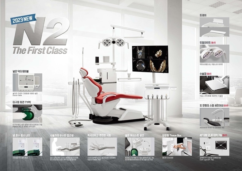 인체공학적으로 설계된 유압 방식인 N2는 환자에게 더욱 편안한 진료를 위한 최상의 포지션을 제공한다. 싱글쿠션 등판 및 시트, 헤드레스트, 팔걸이 등 모든 구성요소는 환자들이 편안하게 진료를 받을 수 있도록 설계됐다. 등판의 기울기에 따라 함께 움직이는 시트는 환자의 몸을 전체적으로 부드럽게 지지해주고, 편안한 포지션을 제공한다. 비교적 얇은 등판은 술자와 환자 모두에게 최상의 접근성을 제공한다.