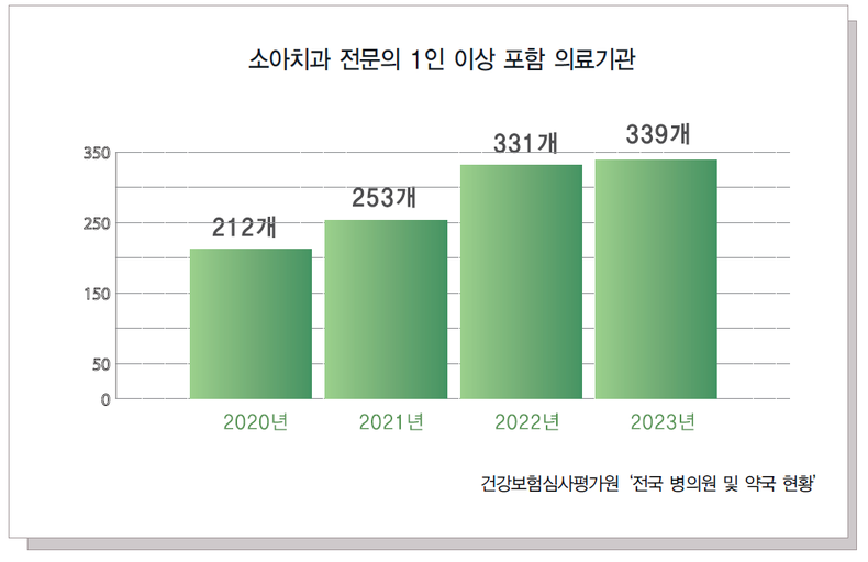 이와 대조적으로 전국 소아치과 의원 수는 점차 늘어나고 있는 것으로 파악됐다. 건강보험심사평가원이 공개한 ‘전국 병의원 및 약국 현황 자료’를 살펴보면 올해 6월 기준으로 소아치과를 진료항목에 포함한 치과 중 소아치과 전문의 1명 이상이 등록된 치과병의원은 339곳인 것으로 확인됐다. 지난해 말 전문의 1명 이상 등록된 기관은 331곳이었으며, △2021년 253곳 △2020년 212곳 등과 비교해봤을 때 그 수가 점진적으로 증가하고 있는 것을 확인할 수 있었다.