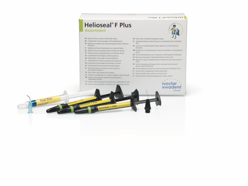 Helioseal F Plus는 불소를 방출하는 백색의 광중합형 열구전색제로 소구치와 대구치의 소와열구를 긴밀하게 봉쇄함으로써 우식성 세균으로부터 치아를 보호한다. 우수한 흐름성으로 복잡한 치면에도 쉽게 적용 가능하며, 매끄러운 실란트 표면을 생성하는 미세필러가 함유돼 있어 소와열구를 부드럽게 봉쇄할 수 있다.