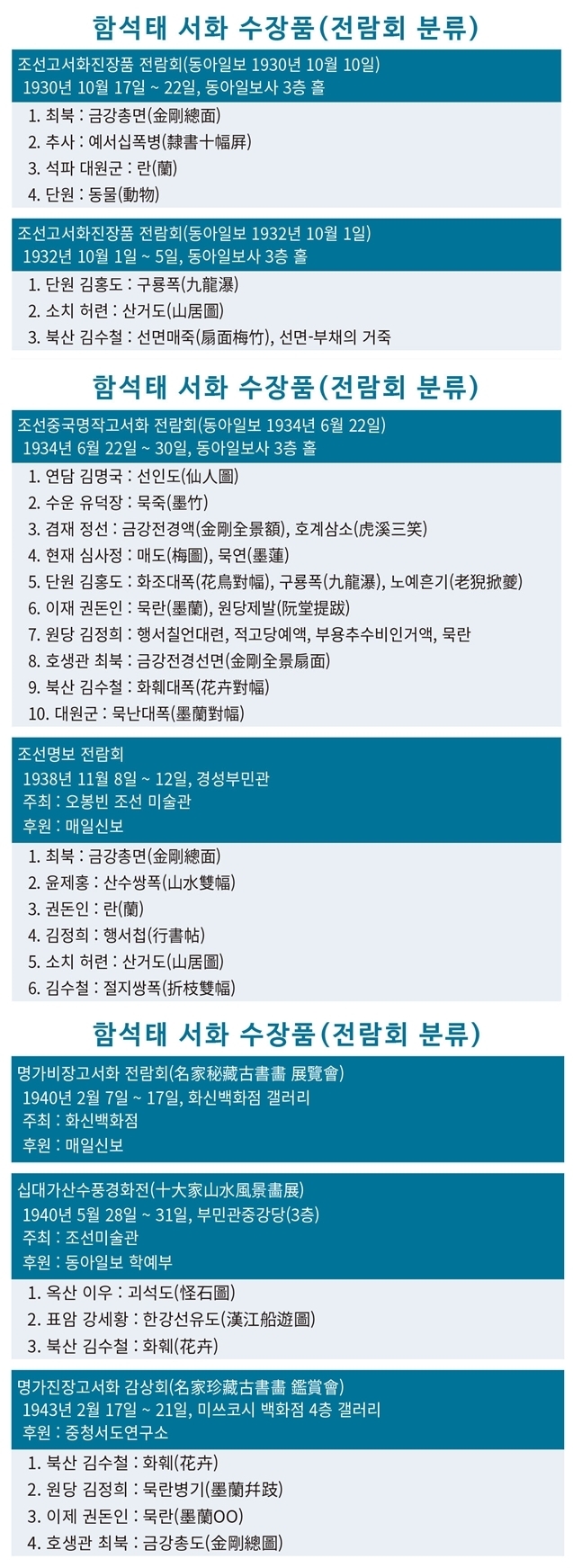 함석태의 수장품 목록을 보면 그가 얼마나 금강산을 좋아했는지를 가늠할 수 있다. 그는 7번의 전람회에 참여할 때 최북의 금강산 그림을 4번이나 출품하였다. 또한 정선의 금강전경액(金剛全景額)도 소장하고 있었다. 함석태는 최북의 금강총면(金剛總面)과 금강전경선면(金剛全景扇面)을 갖고 있었다. 그런데 최북의 금강총면은 전람회마다 작품명이 다르다. 1930년과 1938년 전람회에서는 금강총면(金剛總面), 1943년 고서화 감상회에는 금강총도(金剛總圖)로 적혀있다. 금강총면과 금강총도는 같은 단어라 봐도 무방할 것 같다.