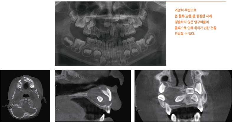 더 나아가 과잉치 주변에는 물혹인 낭종이 생길 수 있으며, 이 낭종이 커지면 주변 뼈를 파괴하고 인접한 치아들을 밀어내어 영구치의 변위를 일으킬 수 있습니다.