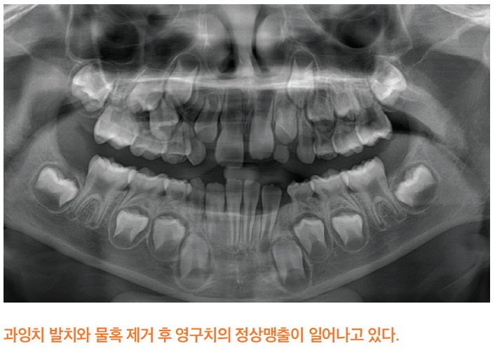 수술적 접근법은 과잉치의 위치와 맹출 방향에 따라 다르며, 과잉치가 매우 깊이 매복되어 있는 경우에는 전신마취 하에 발치를 시행하기도 합니다. 또한 발치 후에는 정기적인 추적관찰을 통해 영구치의 맹출 상태를 지속적으로 평가해야 합니다. 아이의 협조도가 좋은 경우 국소마취 하에 발치를 시행할 수 있으나, 연령이 어리거나 치과치료에 대한 불안감이 높은 아이, 또는 수술의 난이도가 높은 경우에는 진정법이나 전신마취를 활용하여 아이에게 심리적 안정감을 제공하면서 안전하고 효과적으로 수술을 진행할 수 있습니다.