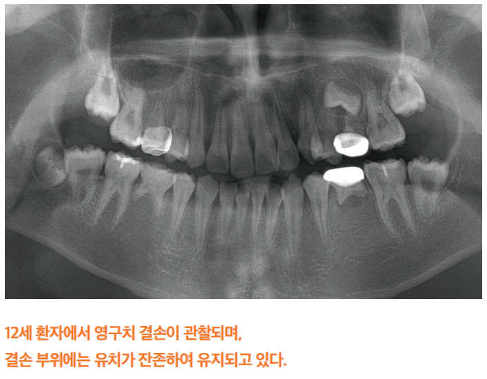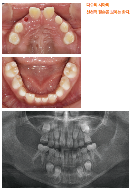 선천성 결손치란 태어날 때부터 영구치가 하나 이상 없는 상태를 의미하며, 사랑니(제3대구치)를 제외한 정상적인 28개의 영구치 가운데 일부 치아가 결손된 경우를 말합니다. 이는 치아의 발생 과정 중 치배 형성에 문제가 생겨 발생하게 됩니다. 결손된 치아의 수에 따라 일부 치아가 결손된 경우를 부분무치증(hypodontia), 6개 이상의 치아가 결손된 경우를 oligodontia, 그리고 모든 치아가 결손된 경우를 완전무치증(anodontia)으로 분류합니다. 이 중 oligodontia와 완전무치증은 비교적 드물게 나타납니다.