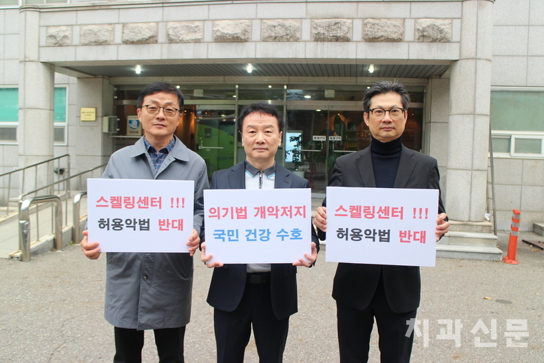 한편 저지연대는 지난 11월 1일, 치과의사회관에서 열린 지부장회의에 앞서 ‘의기법 개악 저지, 국민 건강 수호’, ‘스켈링센터 허용악법 반대’ 등 문구가 적힌 피켓을 들고 시위를 진행했다.