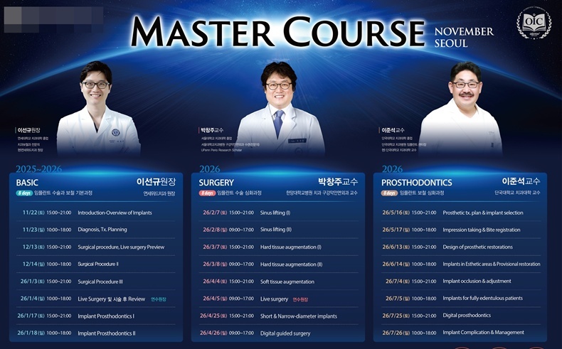 마지막으로 이준석 교수의 보철 과정은 내년 5월 16일부터 7월 26일까지 진행되는데, 이 과정에서는 보철을 이용한 치료계획부터 디지털 치과를 위한 CAD/CAM을 이용한 어버트먼트의 활용, 무치악 케이스에서 로케이터를 통한 implant overdenture 등 다양한 보철 과정을 다룬다.