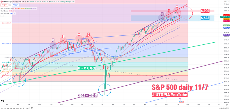 올해 4월의 급락 국면을 떠올려보자. S&P500은 단기간에 큰 폭으로 하락했지만, 이후 빠른 반등으로 손실을 회복했다. 당시에는 경기 침체 우려가 제한적이었으며, 트럼프의 관세전쟁 선포로 인한 시장 외적 충격이 주요 요인이었다. 그러나 2025년 11월 현재, 금리 사이클의 다음 단계인 ‘경제위기 C 국면’에서는 상황이 전혀 다르다. 금리 인하가 이미 상당 부분 진행된 상태에서 경기 침체가 본격화될 경우, 단순한 기술적 반등에 그치지 않고 중기 조정 또는 장기 하락장으로 이어질 가능성이 높다.