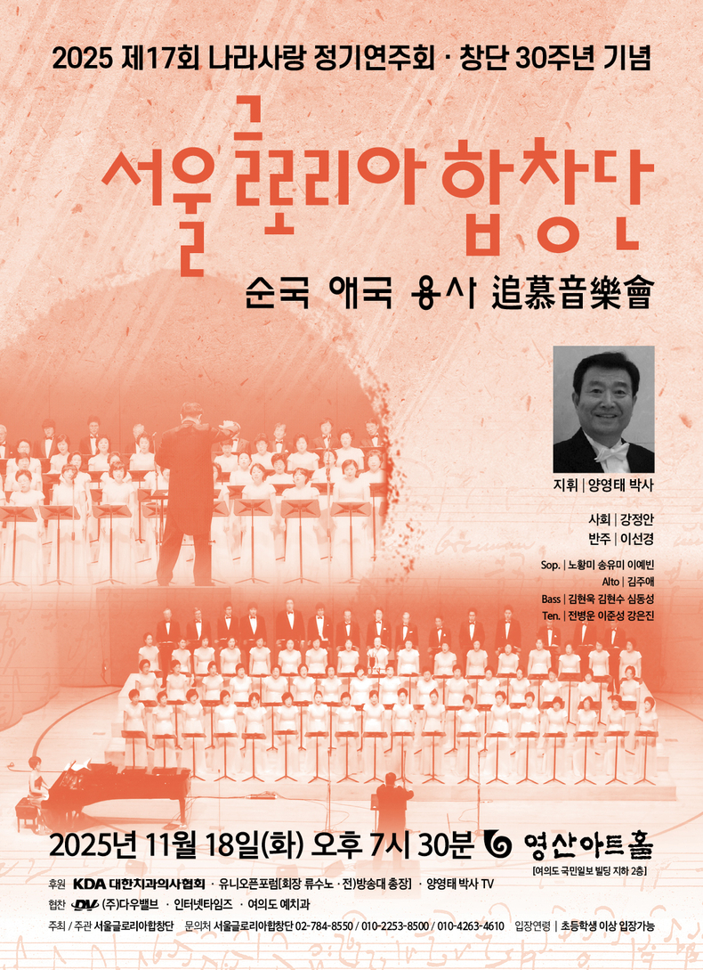 [치과신문_이가영 기자 young@sda.or.kr] 창단 30주년을 맞이한 서울글로리아합창단(단장 양영태·여의도예치과원장)이 오는 11월 18일 영산아트홀에서 ‘2025 제17회 나라사랑 정기연주회 및 창단 30주년 기념 공연’을 개최한다.