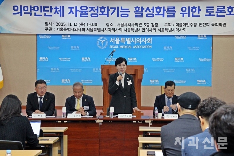 [치과신문_전영선 기자 ys@sda.or.kr] 국회 법제사법위원회 전현희 의원(더불어민주당 수석최고위원·서울 중구성동구갑)이 주최하고 서울시치과의사회와 서울시의사회, 서울시한의사회, 서울시약사회 등 서울시의약인단체가 공동 주관한 ‘의약인단체 자율정화기능 활성화를 위한 토론회’가 지난 11월 13일 서울시의사회에서 개최됐다. 이번 토론회는 전현희 의원이 의료기관이나 약국 개설 시 해당 지역 의약인단체 지부에 개설신고를 하도록 함으로써 사무장병원과 면허대여약국 개설을 원천차단하는 의료법과 약사법 개정안 발의 이후 이뤄졌다.