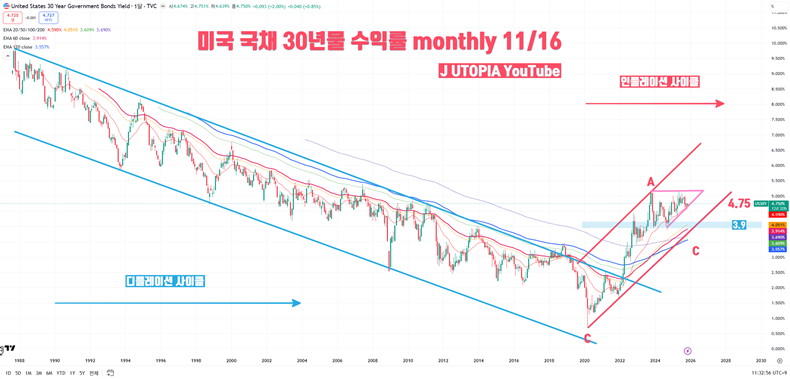 이번 금리 사이클의 가장 큰 특징은 인플레이션을 동반한 금리 인하기라는 점이다. 과거 디플레이션 사이클에서는 금리 인하가 장기채 금리의 하락과 채권 가격 상승으로 직결되는 구조였지만, 이번 사이클에서는 장기 금리가 오히려 장기적으로 우상향하는 흐름을 보이고 있다. 미국채 10년물과 30년물 수익률의 장기 월봉 흐름을 보면, 디플레이션 사이클을 형성했던 하락 채널을 2018년 이후 상향 돌파했고 코로나 위기 당시 잠시 하단까지 밀렸으나 이후 다시 상승 추세로 복귀했다. 이러한 장기 금리 구조는 이번 주기가 인플레이션 사이클임을 뚜렷하게 뒷받침한다.