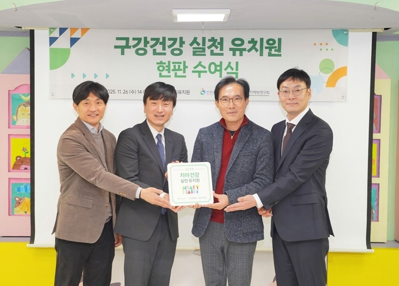 [치과신문_신종학 기자 sjh@sda.or.kr] 충·치예방연구회(공동회장 이병진·정재연, 이하 충치연)가 인천광역시교육청 및 롯데웰푸드와 함께 추진한 ‘2025 유아구강건강교육’ 사업을 성공적으로 마무리하고, 지난 11월 26일 수료기관을 대상으로 ‘치아건강 실천 유치원’ 현판 전달식을 진행했다.