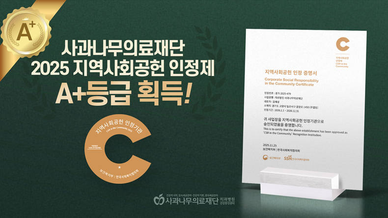 [치과신문_신종학 기자 sjh@sda.or.kr] 사과나무치과병원을 운영하고 있는 사과나무의료재단(이사장 김혜성·이하 재단)이 보건복지부와 한국사회복지협의회가 공동 주관하는 ‘2025년 지역사회공헌 인정제’에서 A+등급을 획득, 인정기관으로 선정됐다.
