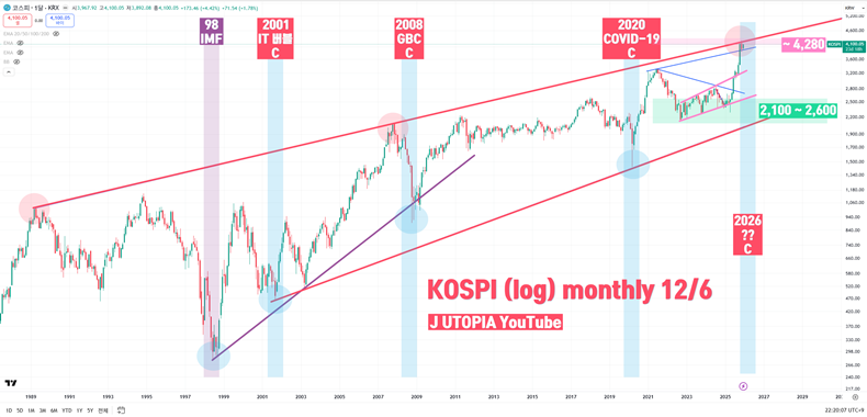 필자가 2024년 말, 코스피가 2,400선에 머물던 시점에서 본지를 통해 3,000선까지의 상승을 전망할 수 있었던 것도 이러한 장기 추세 구조와 프랙탈 분석에 근거했기 때문이다. 실제로 코스피는 전망치를 넘어 2025년에 들어 4,000선을 돌파했는데, 이 강한 추가 상승은 달러 약세와 미국 기술주의 과열이 동시에 작용한 결과에 가깝다. 특히 4,200선 부근에서 장기 로그 저항을 터치한 뒤 이어진 횡보 흐름은 현재 구간이 이미 과열 신호권에 진입했음을 명확히 보여준다.