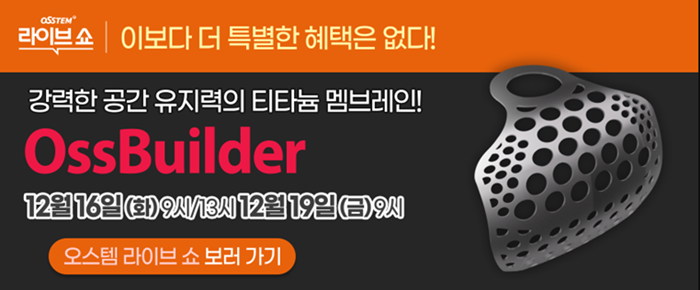 [치과신문_신종학 기자 sjh@sda.or.kr] 오스템임플란트(이하 오스템)의 오스템 라이브쇼가 오는 12월 16일부터 19일까지 오스템이 개발한 비흡수성 티타늄 멤브레인 ‘OssBuilder’ 특집 방송을 진행한다.
