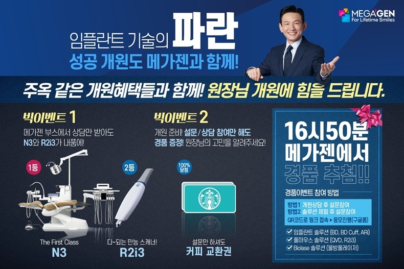 메가젠 관계자는 “이번 전시에서는 개원 및 확장 이전을 준비하는 임상가들에게 힘이 되어줄 빅 이벤트가 함께 한다”고 밝혔다. 당일 오후 4시 50분 경품 추첨존에서 메가젠 제품 및 개원 상담자를 대상으로 프리미엄 유니트체어 N3와 구강스캐너 R2i3 추첨을 진행한다. 개원 준비 설문에 참여하면 스타벅스 커피 쿠폰을 받을 수 있고, 메가젠 부스 방문 시 오프리케어 심플 키트를 받을 수 있다. 솔루션 핸즈온 및 상담 시에는 가디언즈 글러브, 메가세움 포르테, 메가실, 메가심스탁 등을 받을 수 있다.