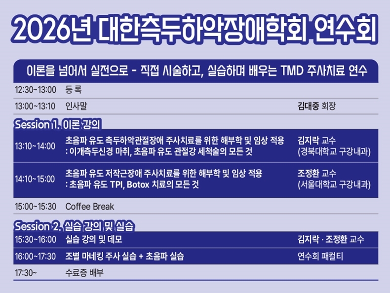 연수회는 먼저 김지락 교수(경북치대 구강내과)의 ‘초음파 유도 측두하악관절장애 주사치료를 위한 해부학 및 임상적용-이개측두신경 마취, 초음파 유도 관절강 세척술의 모든 것’ 강연과 조정환 교수(서울대 구강내과)의 ‘초음파 유도 저작근장애 주사치료를 위한 해부학 및 임상적용-초음파 유도 TPI, Botox 치료의 모든 것’ 강연으로 시작된다.