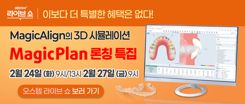 [치과신문_신종학 기자 sjh@sda.or.kr] OSSTEM 라이브쇼가 오는 2월 24일과 27일 오스템임플란트(이하 오스템)의 투명교정장치 매직얼라인의 3D 치아이동 시뮬레이션, MagicPlan(이하 매직플랜) 특집 방송을 진행한다. 오는 3월 30일 공식 출시를 앞두고 이번 방송을 통해 처음 공개되는 매직플랜은 교정 시작 전 환자의 치아이동 계획과 결과를 3D 기반으로 검토할 수 있는 소프트웨어다.
