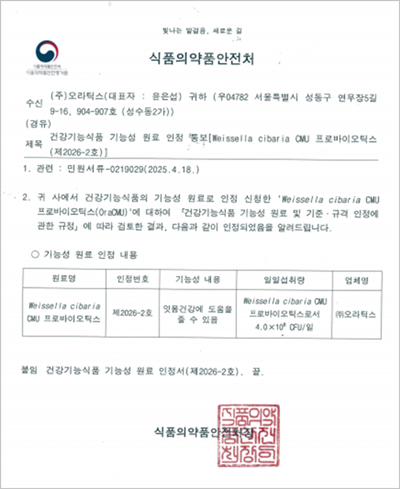 [치과신문_신종학 기자 sjh@sda.or.kr] 구강 마이크로바이옴 전문 기업 오라틱스(대표 윤은섭)가 독자 개발한 구강유산균 ‘OraCMU®’가 잇몸 건강(Gum Health)에 도움을 줄 수 있다는 것을 식품의약품안전처로부터 인정받아 ‘개별인정형 기능성 원료(인정번호 : 제2026-2호)’로 공식 등록됐다고 지난 2월 19일 밝혔다.