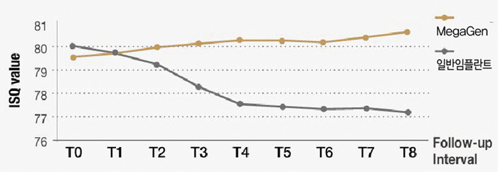 메가젠 측에 따르면 이 같은 컨셉은 주요 Human Study에서 D4 골질에서도 식립 토크(ITV) 40Ncm 이상을 유지했으며, 40개의 임플란트 중 39개에서 ISQ 70 이상을 기록, Early Loading에 적합한 안정 범위를 보였다. 또한 일반적인 일시적 ISQ 저하 현상 없이 안정적인 수치를 유지했다. 이러한 결과는 AnyRidge와 BLUEDIAMOND 임플란트에 적용된 핵심 기술에서 비롯된다는 것.