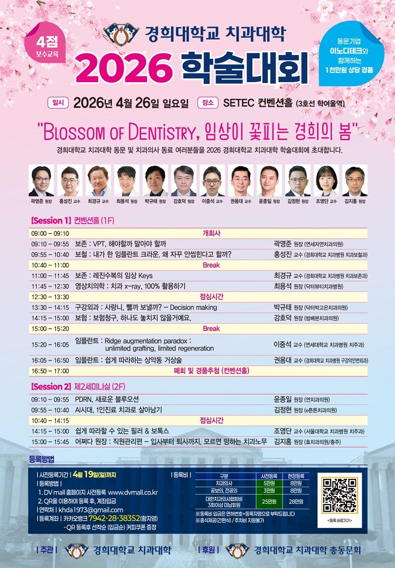 [치과신문_전영선 기자 ys@sda.or.kr] 경희대학교치과대학(학장 권용대·이하 경희치대)이 주관하고 경희치대총동문회(회장 김소현·이하 동문회)가 후원하는 2026 학술대회가 오는 4월 26일 세텍(SETEC) 컨벤션센터에서 개최된다.