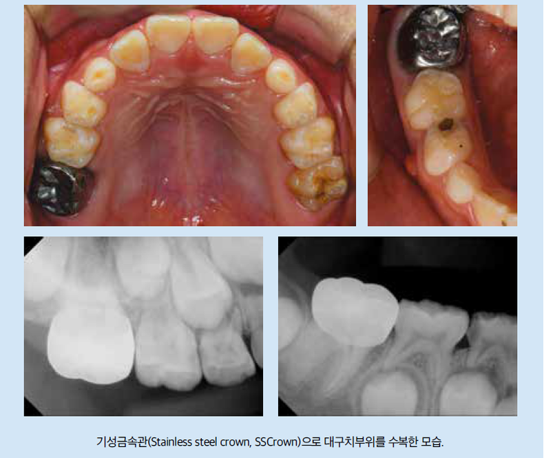 특히 제1대구치(어금니)가 심하게 손상된 경우에는 기성금속관(Stainless steel crown, SS Crown) 수복이 필요합니다. 6~8세경에는 제1대구치가 완전히 올라오지 않은 상태이므로, 기성금속관을 씌워 외부 자극을 차단하고 시린 증상을 없애며 추가적인 치아 파괴를 막아야 합니다. 성인이 된 후에는 금이나 세라믹 크라운으로 교체할 수 있습니다.