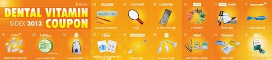 전시장 알짜 쿠폰이 가득한 ‘덴탈비타민 쿠폰’도 올해 더욱 풍성하고 다양해졌다는 게 관계자의 설명이다. 총 15종 쿠폰이 마련된 SIDEX 2013 덴탈비타민 쿠폰에는 4일과 5일 양일간 FreshLine 신상품을 가득 담은 샘플백을 비롯해 LION칫솔 & 휴대용 케이스 세트, 새롭고 편리해진 Tempbond & Tempbond NE Unidose 샘플, SE BOND 브러시, SHOFU OneGloss PS, Mani 다이아버(핸드파일), Centrix 다이아몬드 스트립 GingiTrip, 샤인덴탈에서 제공하는 일회용 바이트 트레이 샘플 등 각종 샘플 등이 포함돼 있다.