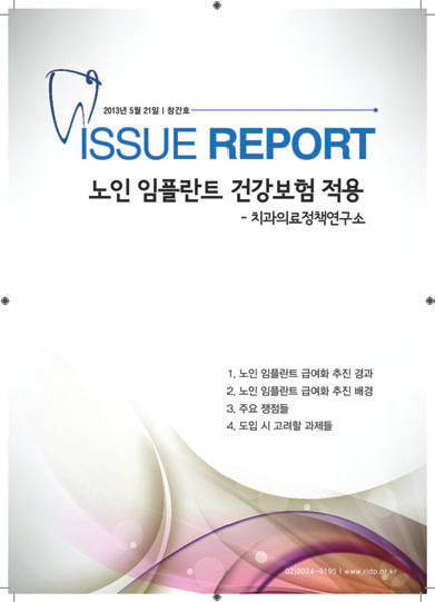 ‘노인임플란트 보험급여화’와 관련한 쟁점들을 정리한 창간호에는 노인임플란트 급여화 추진경과에서부터 추진 배경, 주요 쟁점과 도입 시 고려해야 할 과제들이 자세히 정리돼 있다. 정책연구소 측은 노인 임플란트가 도입되기 위해서 해결해야할 선행 과제를 제시했다.
